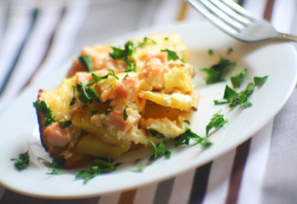 Запеченный картофель получается ароматным и пряным, а сырный соус с ветчиной отлично дополняют это блюдо!