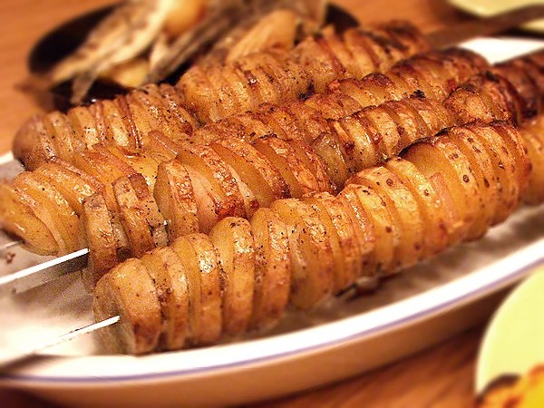 Нанизать на шампуры ломтики картофеля и сала, посыпать розмарином или сухими травами по вкусу. Завернуть в фольгу, закрепить концы, чтобы не вытекал жир. Готовить на углях около 20 минут. Не нужно торопиться – пусть сало растает, и картофель станет мягким. Затем снять фольгу и готовить до золотистого цвета.