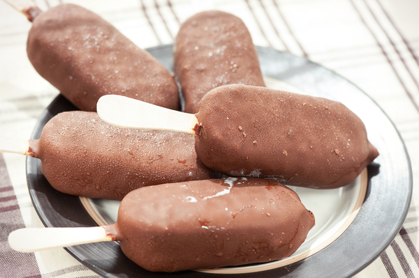 Формочки окатить кипятком и осторожно вынуть мороженое. Окунать его в теплую глазурь как можно быстрее и, достав, подержать в руке, пока не застынет. Перекладывать сразу в морозилку на бумагу для выпечки. Когда подмерзнет - можно завернуть, а можно сразу съесть.