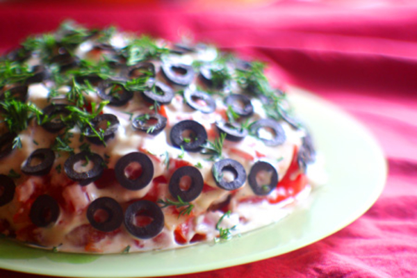 Помидоры, сыр и куриное филе нарезаем соломкой. Маслины нарезаем кружочками. Выкладываем ингредиенты, каждый слой смазывая майонезом или йогуртом с зеленью и чесноком: