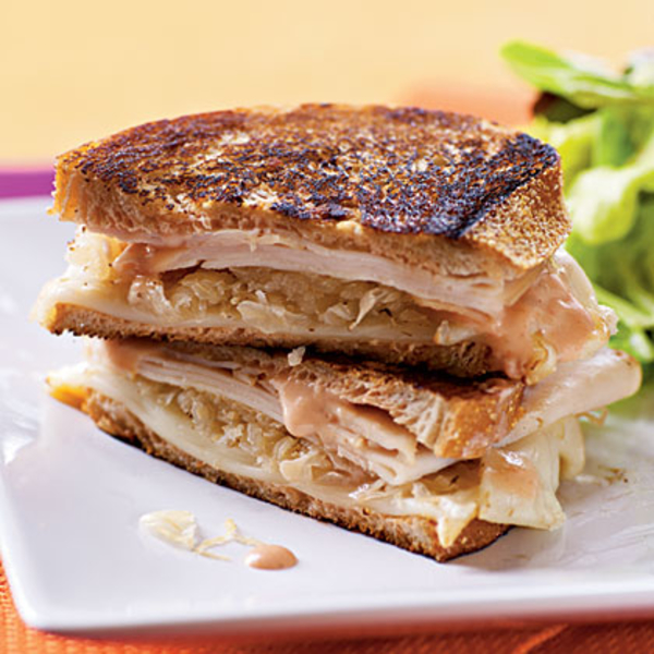 На нижний хлебец положить сыр, квашеную капусту, индейку, затем опять сыр и хлеб. Большую сковороду хорошо разогреть. Сэндвичи сверху слегка сбрызнуть оливковым маслом и выложить на сковороду. Поджаривать с каждой стороны до образования золотистой корочки и расплавления сыра.