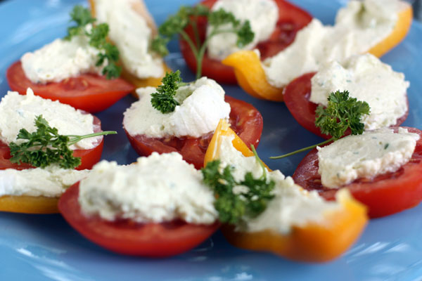 Нарезать помидоры кружочками, а перец - длинными лодочками, намазать сырный крем и подавать.