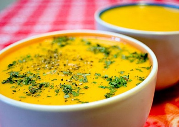 С помощью блендера превратить содержимое в овощное пюре. Добавить оставшийся бульон, кусочки вареной курицы и довести до кипения. В суп-пюре добавить сливки, посолить, поперчить по вкусу и снять с огня. Овощной суп-пюре подавать со свежей зеленью.