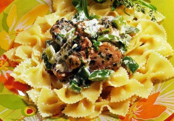 Обжаренную телятину смешиваем с овощами и все вместе немного подогреваем. При подаче к столу выкладываем пасту на блюдо, сверху помещаем мясо в сметанно-овощном соусе и украшаем блюдо свежей зеленью эстрагона.