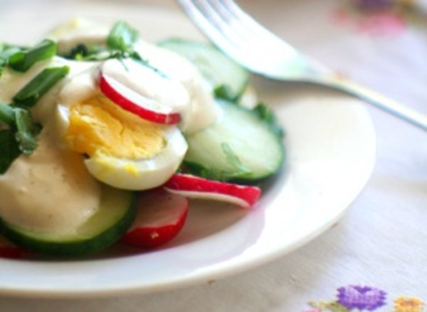 Яйца отвариваем вкрутую и нарезаем кружочками. Редис и огурцы моем и нарезаем кружочками. Лук, петрушку и укроп мелко порубить.