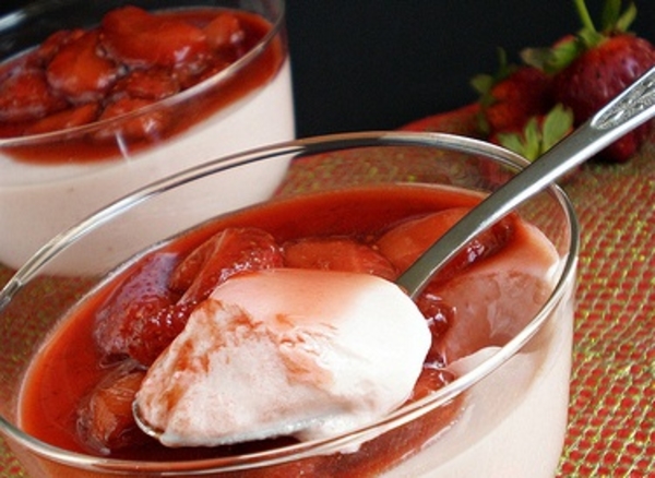 Клубнику порезать на половинки или четыре части. В кастрюле соединить все ингредиенты и варить на медленном огне примерно 10 минут. Остудить и подавать с панна коттой.
