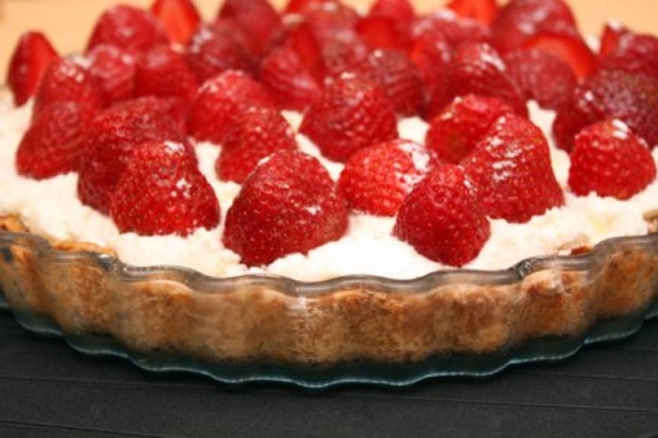 Когда сливки хорошо загустеют, добавляем сахарную пудру и, продолжая взбивать, осторожно вливаем растворенный желатин. Это придаст нашему крему устойчивость и плотность. Так как сливки холодные, они загустеют практически сразу и можно будет приступать к выкладыванию сливок на основу. На остывший корж кладем сливки и распределяем их равномерным слоем. Если крем мягкий, ставим пирог в холодильник, чтобы он слегка застыл.