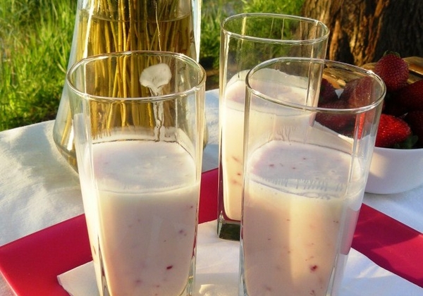 Поставить полученый смузи в холодильник на 30 минут. Подавать клубнично-кефирный смузи, украсив ягодой клубники.