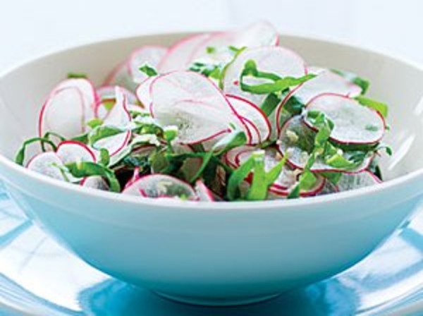 Ингредиенты: редис - 8 шт., латук - 3 листа, кресс-салат - 1 стакан, растительное масло - 1/4 стакана, уксус 3%-й - 1/2 ч. ложки, соль - 1 щепотка