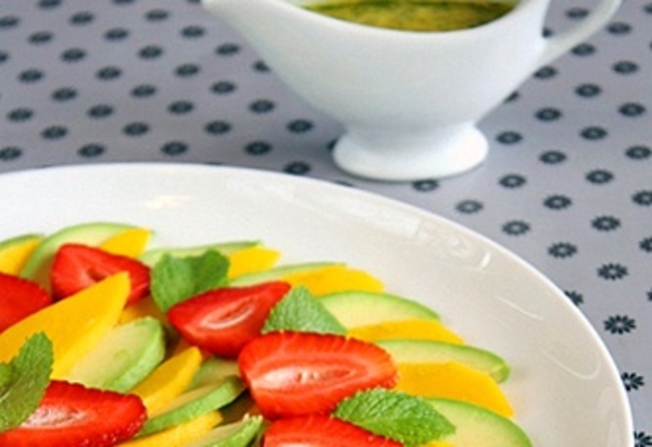 Авокадо и манго очистить от кожуры, нарезать тонкими дольками, сбрызнуть лимонным соком и выложить на плоскую тарелку. Клубнику нарезать пластинками и выложить сверху манго и авокадо.