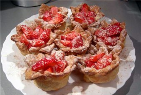 Если ты не уверена, что корзинки получились герметичными, перед тем, как наполнять клубникой, смажь их изнутри слоем желе и остуди. Тогда образуется защитная желейная пленка и все останется внутри. В конце посыпаем корзинки сахарной пудрой.