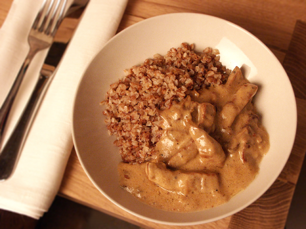 Кладем грибы. Тщательно перемешиваем. Посыпаем парой щепоток молотого мускатного ореха. Варим на самом медленном огне пять минут, постоянно перемешивая. Выливаем соус в мясо. Перемешиваем, соскребая со стенок сковороды все выделившие из мяса соки. Консистенция соуса должна быть, как у сметаны. Цвет должен быть бежевым и однородным. Снимаем с огня. Пусть постоит под крышкой минут десять.