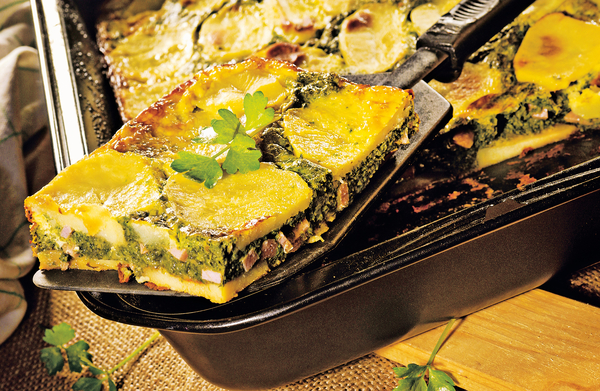 - Противень для запекания смажь маслом. Уложи кусочки картофеля, затем – шпинатную массу и снова картофель. Посыпь тертым сыром. Запекай около 20 мин.