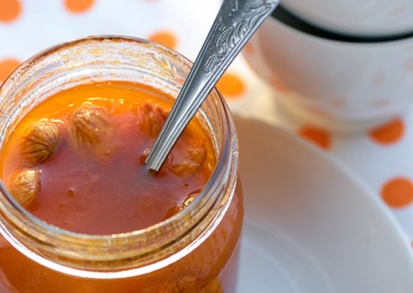 Абрикосы очистить от кожицы и косточек, разрезав на половинки. Абрикосовые косточки разбить и вынуть ядра. Высыпать абрикосы и косточки в кастрюлю.
