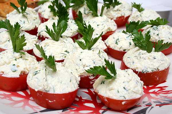 Творог растереть с чесноком, майонезом (можно заменить сливками), добавить мелко нарезанную зелень. Все перемешать. Помидоры помыть, нарезать кольцами толщиной около 1 см. Намазать на помидоры приготовленную творожную массу. Украсить листьями петрушки.