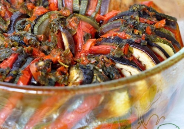 Сверху овощи посолить, равномерно распределить сверху пряную приправу и сбрызнуть оливковым маслом. Накрыть форму с рататуем пергаментной бумагой и запекать 60 минут в нагретой до 180-190 градусов духовке. После приготовления дать блюду постоять 10-15 минут, не открывая пергамент.