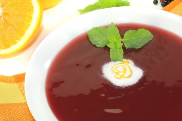 Приготовить в блендере пюре из 1/3 смеси апельсинов и черешни. Перелить пюре в кастрюлю и добавить оставшуюся смесь. Поставить в холодильник. Перед подачей влить во фруктовый суп шампанское и вишневую настойку. Перемешать. При подаче украсить съедобными цветками и листиками свежей мяты.