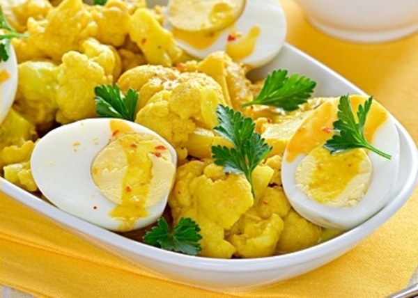 Яйца сварить вкрутую, обдать холодной водой, очистить от скорлупы. Разрезать каждое яйцо вдоль на две половинки. Разогреть в сотейнике масло на среднем огне. Обжарить лук в течение 8 минут. Добавить перец, чеснок и имбирь, готовить еще 2 минуты. Добавить картофель. Готовить, помешивая, 4 минуты. Положить пасту карри, перемешать и жарить 1 минуту. Добавить цветную капусту, готовить еще 1 минуту. Влить кокосовое молоко, тщательно перемешать.