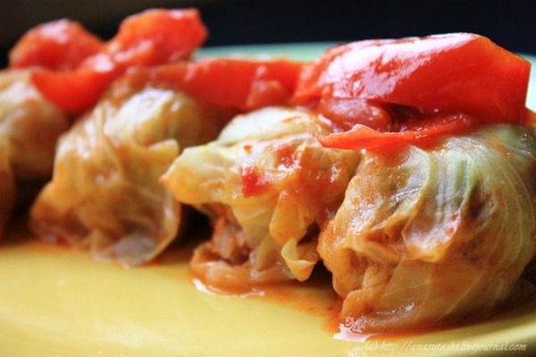 Сформированные голубцы обжарить на среднем огне 3-5 минут. После чего добавить нарезанные дольками томаты, томатную пасту и тушить на слабом огне до готовности.
