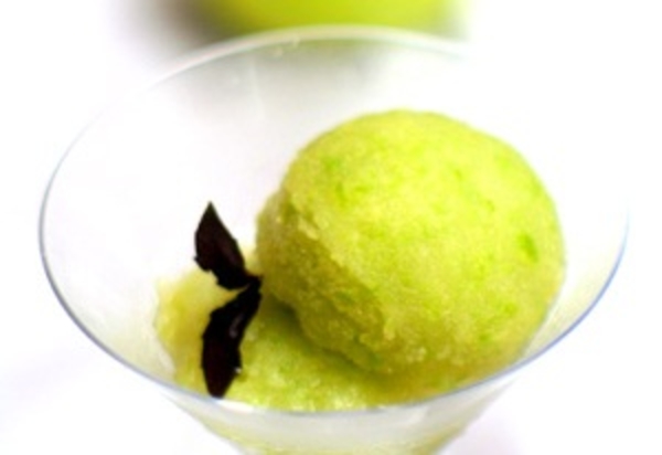 Утром смешиваем в кастрюле сахар с водой, даем сиропу покипеть 2 -3 минуты и снимаем с огня. Вынимаем яблоки из морозильной камеры, перекладываем в блендер, заливаем сиропом и быстро измельчаем. Перекладываем смесь в форму и снова отправляем в морозильную камеру на 6 часов. Каждый час сорбе нужно перемешивать.