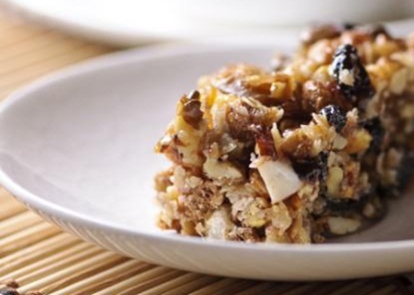Небольшой квадратный противень застелить пергаментом. Выложить смесь и хорошенько утрамбовать. Выпекать при температуре 180 градусов около 30 минут до золотистого цвета. После того, как остынет, вытащить из формы и порезать брусочками.
