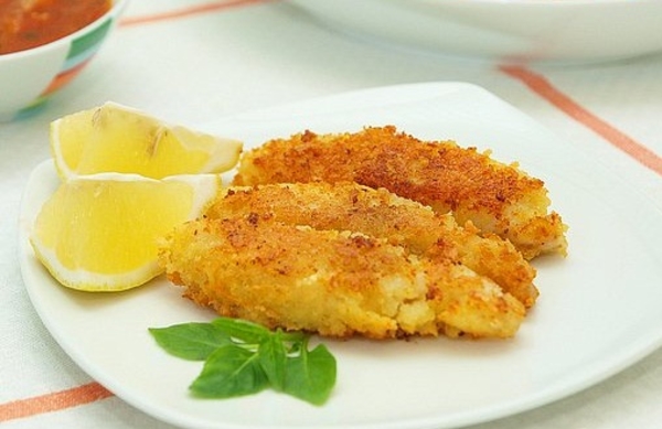 Разрезать рыбное филе на ломтики толщиной 1 см. Яйца взбить с солью и перцем в миске. Смешать хлебные крошки и тертый сыр. Смочить куски филе в яйце, а затем обвалять в сырно-хлебной смеси. Выложить рыбу на разделочную доску и убрать в холодильник охлаждаться.