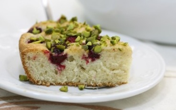 Печь при 190 С 40 минут. Готовый пирог смазать растопленным цветочным медом (чайная ложка) и посыпать нарубленными фисташками (20 грамм). Подавать можно в форме.