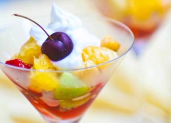 Апельсин очищаем от пленочек  и нарезаем на средние кусочки, клубнику крупно нарезаем. Раскладываем по креманкам апельсины и клубнику и украшаем взбитыми сливками. Готовому салату желательно дать немного постоять в холодильнике.