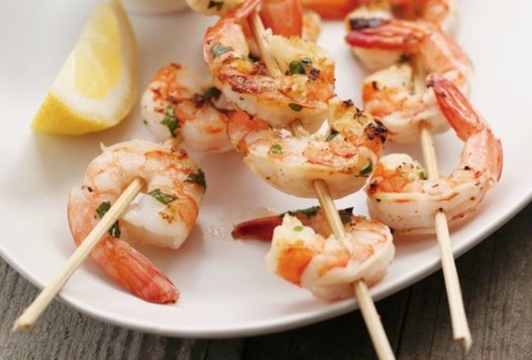 Креветки очистить и замариновать в смеси оливкового масла, перца, соли, лимонного сока, чеснока и чабреца. Затем обжарить с двух сторон креветки на гриле (в течение 5 минут).