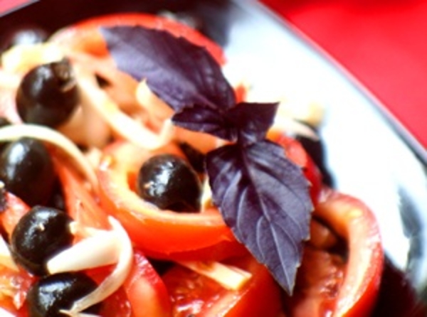 Смешиваем помидоры, лук, маслины и сыр в салатнице, солим и заправляем оливковым маслом. Базилик мелко режем и добавляем в салат.