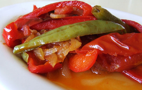 Ингредиенты: 1,4 кг зеленого сладкого перца, 600 г помидоров, 2 головки лука, 80 г свиного жира, 50 копченого шпика, 5 г паприки, соль по вкусу.