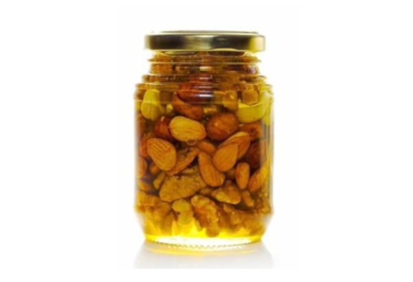 Орехи и сухофрукты промыть, поджарить в духовке или на открытом воздухе. Банки стерилизовать. Укладываем слой орехов, мед, сухофрукты, мед и пряности по желанию. Заполняем всю банку.