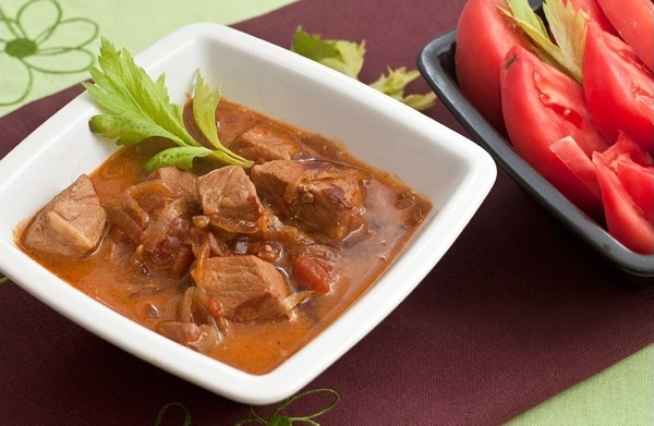 Выложить помидоры в кастрюлю, посолить, влить пиво и тушить на маленьком огне под неплотно закрытой крышкой около часа. В конце приготовления мясо должно стать мягким. Соус можно чуть загустить одной-двумя чайными ложками кукурузной муки. Для этого добавить муку в соус, хорошо размешать и довести до кипения. Подавать мясо горячим, желательно подать хлеб, чтобы можно было макать его в мясной соус.
