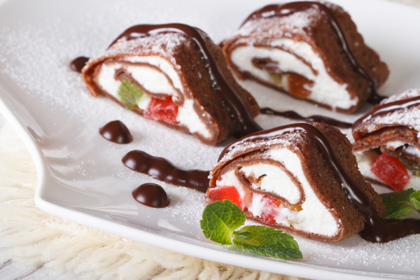 Затем сворачиваем блин в рулетик и обрезаем края. Рулеты нарезаем на небольшие роллы. Затем растапливаем шоколад на водяной бане с 15 г сливочного масла и поливаем им роллы. Их также можно окунать в растопленный шоколад со всех сторон, в зависимости от того, сколько у тебя шоколада. Охлаждаем роллы в холодильнике в течение 15 минут и подаем к столу.