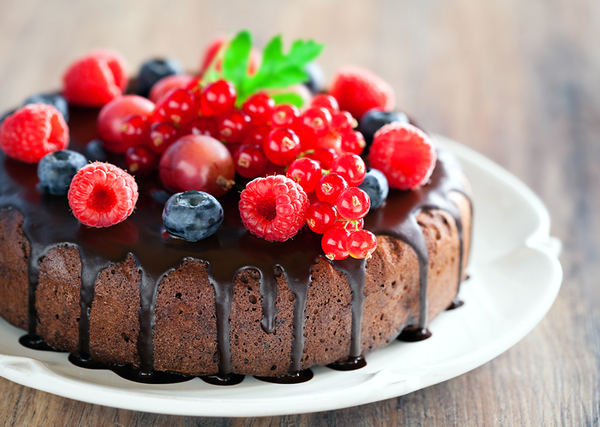 Приготовить глазурь. Шоколад измельчить, залить кипятком, перемешивать до получения гладкой эмульсии. Переложить остывший пирог на сервировочную тарелку, полить шоколадной глазурью и украсить свежими ягодами.