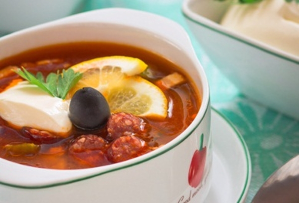 Бульон довести до кипения, выложить мясную поджарку. Вскипятить. Добавить каперсы, маслины и нарезанные огурцы. Выключить, закрыть крышкой и оставить на 30 минут настаиваться. Подавать со сметаной и лимоном.
