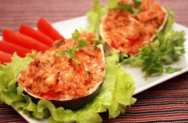 Поставить вариться рис. Из двух баклажанов, разрезанных вдоль пополам, вырезать мякоть. При этом толщина внешнего слоя должна быть около 5 мм.