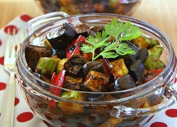 Все овощи помыть. Перец очистить от семян. Баклажаны, перец и кабачки порезать небольшими кубиками. Выстелить противень пергаментной бумагой. Равномерно разложить овощи и полить оливковым маслом. Запекать при температре 180 градусов 25 минут. Выложить овощи в салатницу.