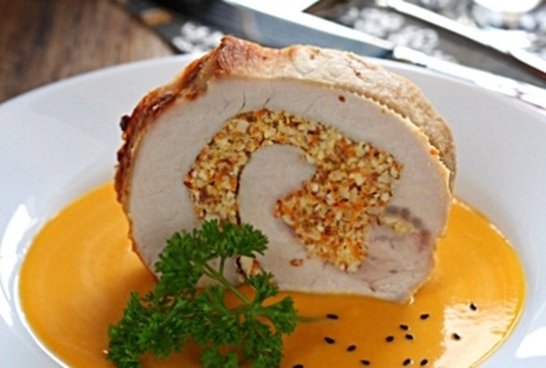 Приготовить начинку. Тыкву, орехи, чеснок и чили измельчить с помощью блендера. Посолить и поперчить начинку по вкусу. Мясо, подготовленное как описано выше, натереть солью и перцем. Разложить начинку на мясе, разровнять, свернуть рулет. Положить рулет в рукав для запекания, закрепить рукав в соответствии с инструкцией на упаковке. Запекать в предварительно разогретой до 190-200 градусов духовке в течении 35-40 минут или до готовности.