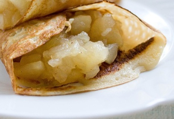 На подготовленную сковороду вылить немного теста и дать ему растечься так, чтобы получился аккуратный блин ( для этого поворачивать сковородку, чтобы тесто распределилось равномерно). Печь, пока на поверхности блина не появятся пузырьки. Перевернуть на другую сторону. Подавать горячие блинчики с яблочным соусом.