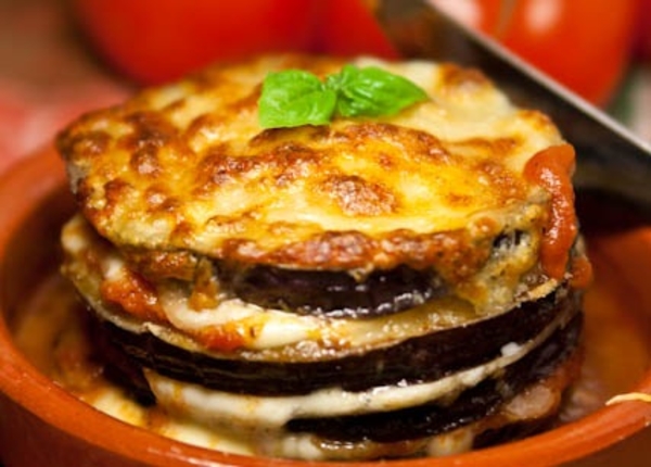 В форму для запекания (лучше всего стеклянную или керамическую), положить на дно ложку томатного соуса, поставить сверху дольку баклажана, затем ломтик моцареллы и посыпать пармезаном. Следующий этаж – томатный соус, баклажан, сыр, и так до тех пор, пока не получится столько башен, сколько планируется порций. Запекать баклажаны в духовке, разогретой до 220 градусов, до тех пор, пока сыр сверху не расплавится и станет золотистым (на это уйдет минут 15-20), и немедленно подавать к столу.