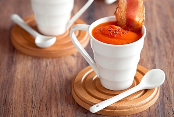 Бекон обжарить на сухой сковороде, выложить на бумажные полотенца. При подаче нарезанный бекон добавить в каждую тарелку, стаканчик или подать суп с целым кусочком бекона.