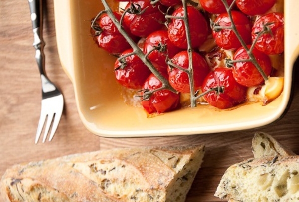 Сверху выложить помидоры и запекать 30-40 минут при температуре 180 градусов. Подавать с багетом. Эта закуска вкуснее всего в теплом виде.