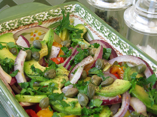 Снять кожицу и нарезать полосками поперек. Авокадо разрезать вдоль, удалить косточку, очистить и нарезать ломтиками поперек. Луковицу нарезать тонкими полукольцами. Перец, авокадо и лук осторожно перемешать.