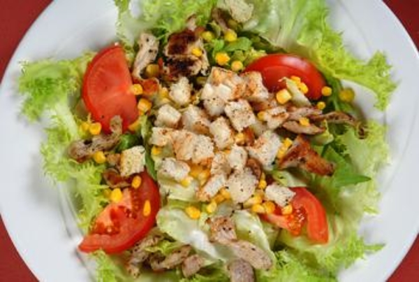 Смешать все ингредиенты, заправить оливковым маслом, лимонным соком, солью и черным молотым перцем. Подавать на салатных листьях.