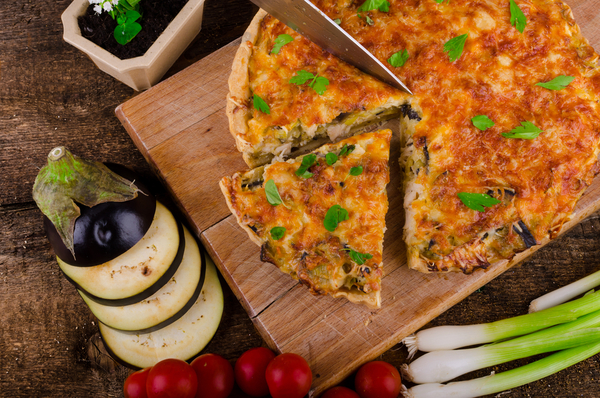 Вынуть форму, убрать фасоль и бумагу. На тарт выложить сначала слой баклажанов, затем - лук. Залить яичной смесью. Поставить опять в духовку, печь около 35-40 минут. Немного остудить и переложить пирог на блюдо. Он вкусен и в теплом, и в холодном виде.