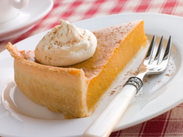 Готовую тыкву пюрировать, добавить коньяк, сахар и специи. Тесто выпекать при температуре 200 градусов 10 минут, затем убрать фасоль и готовить еще 5-10 минут при 180 градусах. В тыквенное пюре добавляем желтки, смешанные со сливками, и лимонную (лаймовую) цедру. Смесь выливаем на основу из теста и запекаем в духовке около 30 минут, пока она не застынет.