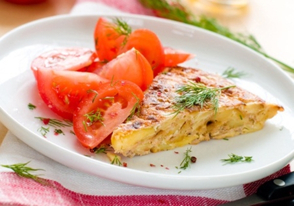 Лук добавить к картофелю и жарить еще 10 минут, постоянно помешивая. Лишнее масло слить. В большой миске взбить яйца с солью и перцем, добавить тунца и обжаренный картофель с луком.