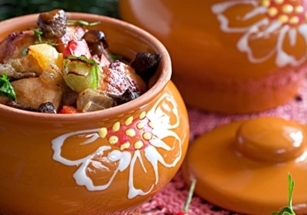В горшочки (или в 1 большой горшок) уложить слоями мясо и овощи с грибами. Влить вино, запекать 20-30 минут в предварительно разогретой до 180 градусов духовке. При подаче посыпать мелко нарезанной петрушкой.