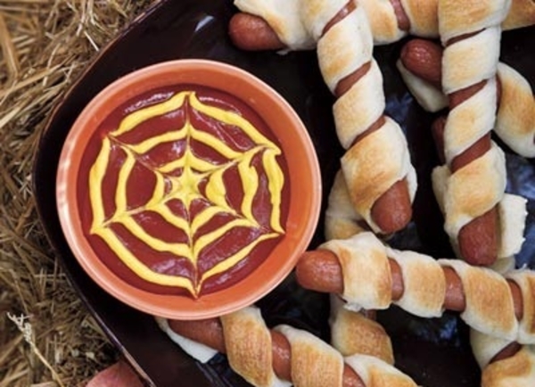 Налить в соусник кетчуп, сделать паутинку из горчицы и подавать с сосисками-мумиями.